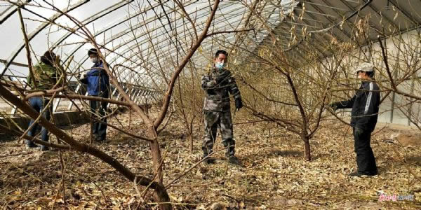 在永昌農場的溫室大棚內,工作人員正在修剪油桃樹枝,讓每株樹冠保持一定形狀和大小,樹體結構合理,枝條疏密得當,便于生長管理。12座大棚共計1200多棵樹,預計20日前完成修剪。農場及早聯系農資調運,為油桃提前上市做好準備。