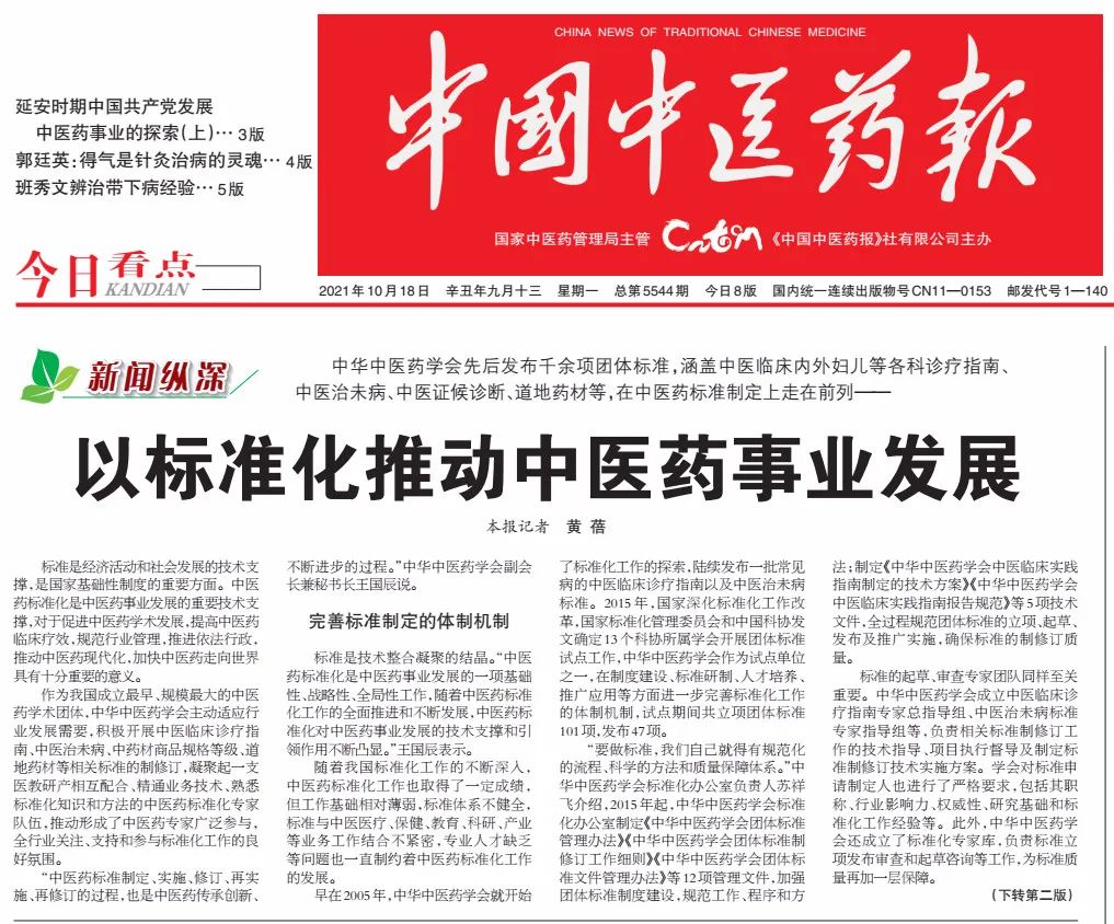 早在2005年,中華中醫藥學會就開始了標準化工作的探索,陸續發布了一批常見病的中醫臨床診療指南以及中醫治未病標準。2015年,國家進行深化標準化工作改革,國家標準委和中國科協發文確定13個科協所屬學會開展團體標準試點工作,中華中醫藥學會作為試點單位之一,在制度建設、標準研制、人才培養、推廣應用等方面進一步完善標準化工作的體制機制,試點期間共立項團體標準101項,發布47項。