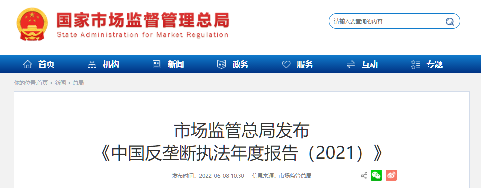 6月8日,國家市場監(jiān)督管理總局發(fā)布《中國反壟斷執(zhí)法年度報告(2021)》,(以下簡稱《報告》)。《報告》指出,2021年,我國市場公平競爭秩序穩(wěn)步向好,反壟斷和防止資本無序擴張取得重要成效。