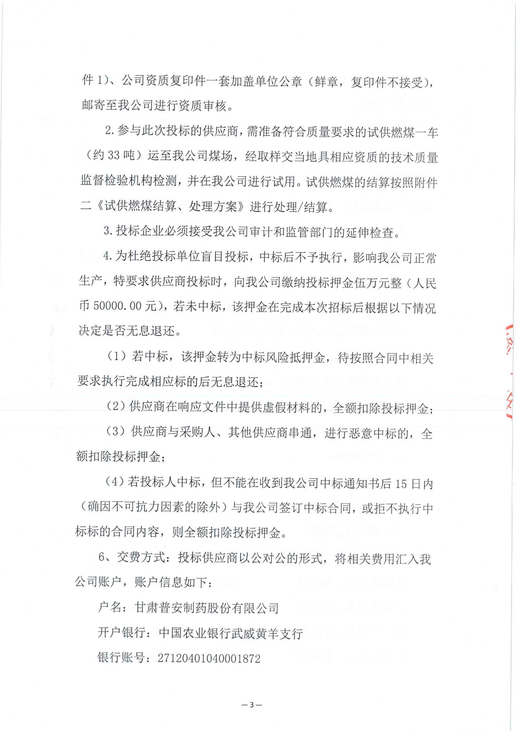 根據《甘肅普安制藥股份有限公司大宗物資招標釆購管理制度》相關規定,對燃煤以公開征集、競爭性磋商的方式進行招標采購,歡迎全國各地符合資格條件的供應商踴躍參加。