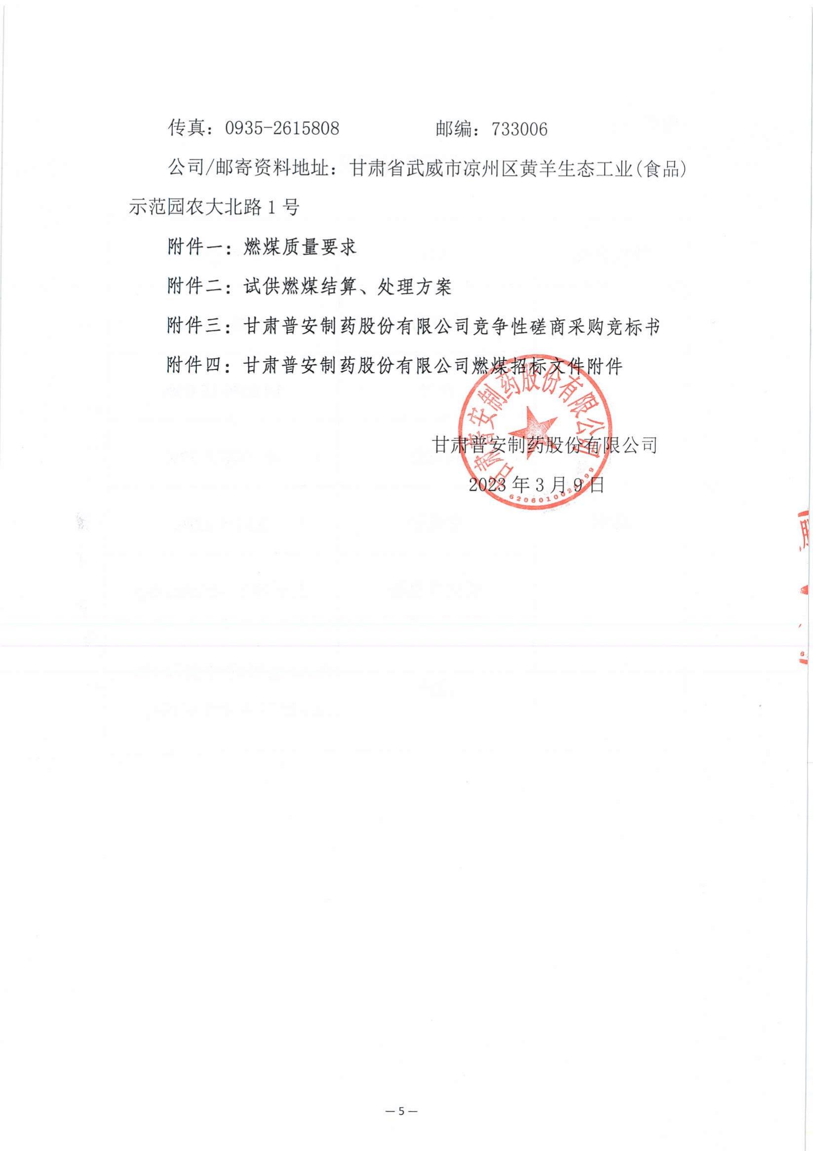 甘肅普安制藥股份有限公司2023年4月燃煤采購競爭性磋商公告