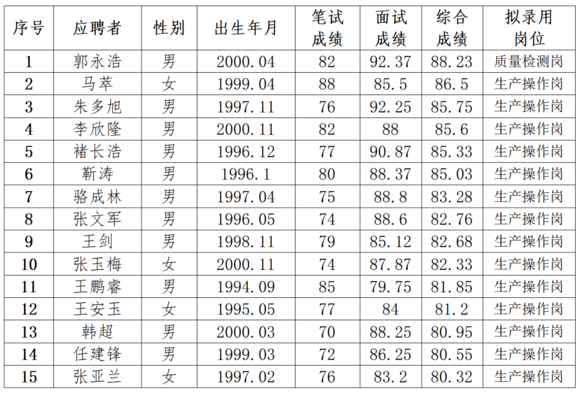 根據《甘肅藥業(yè)集團市場化招聘工作流程》,通過發(fā)布公告、資格審查、組織筆試、面試、體檢等環(huán)節(jié),現將擬招錄的15位人員名單公示如下: