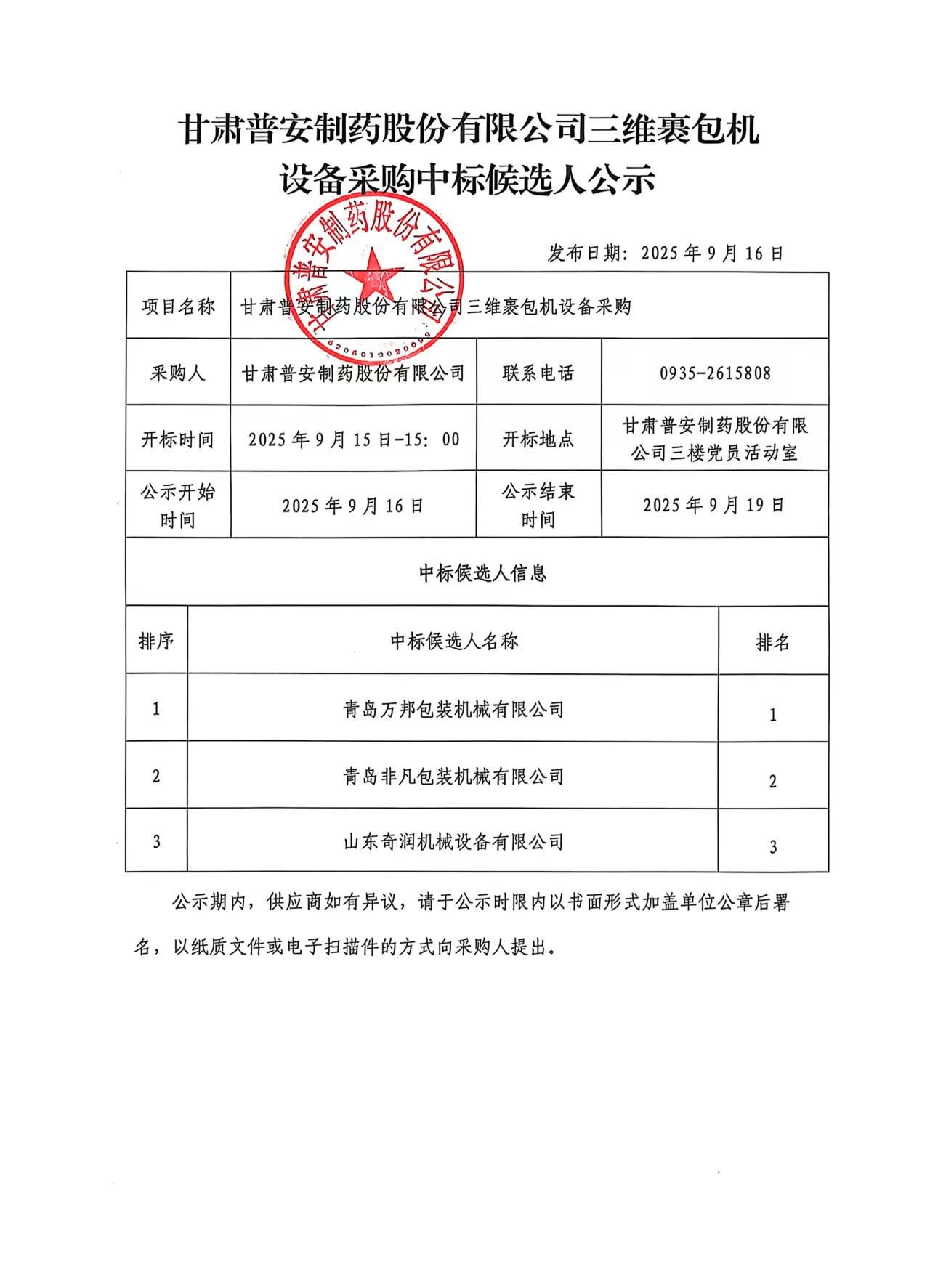 甘肅普安制藥股份有限公司三維裹包機(jī)設(shè)備采購中標(biāo)候選人公示