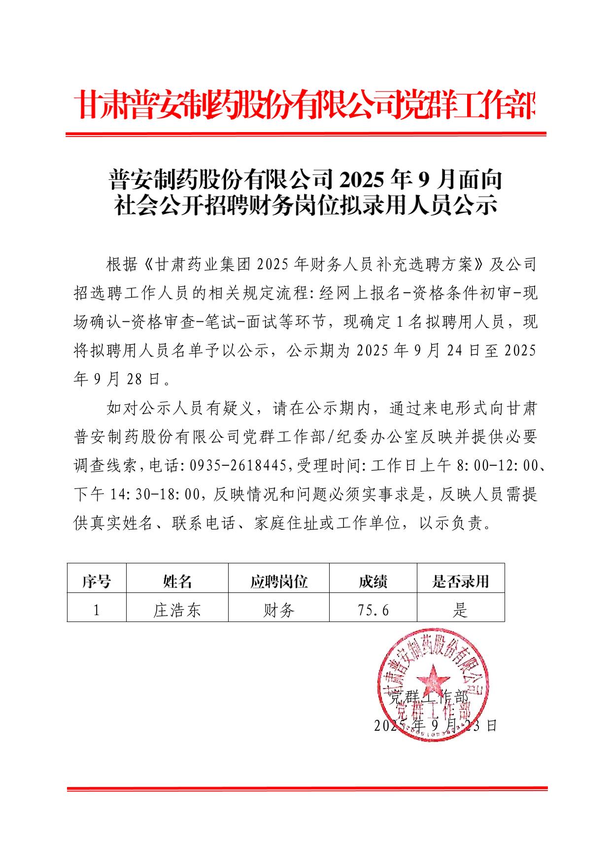普安制藥股份有限公司2025年9月面向社會公開招聘財務崗位擬錄用人員公示